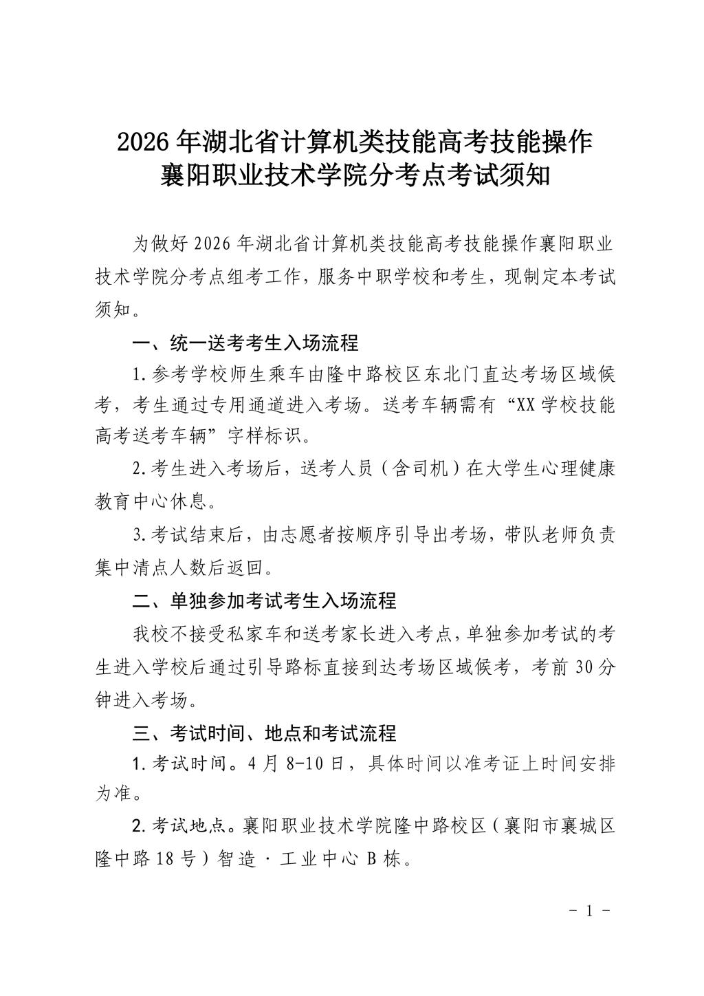 2026年湖北省计算机类技能高考技能操作襄阳职业技术学院分考点考试须知